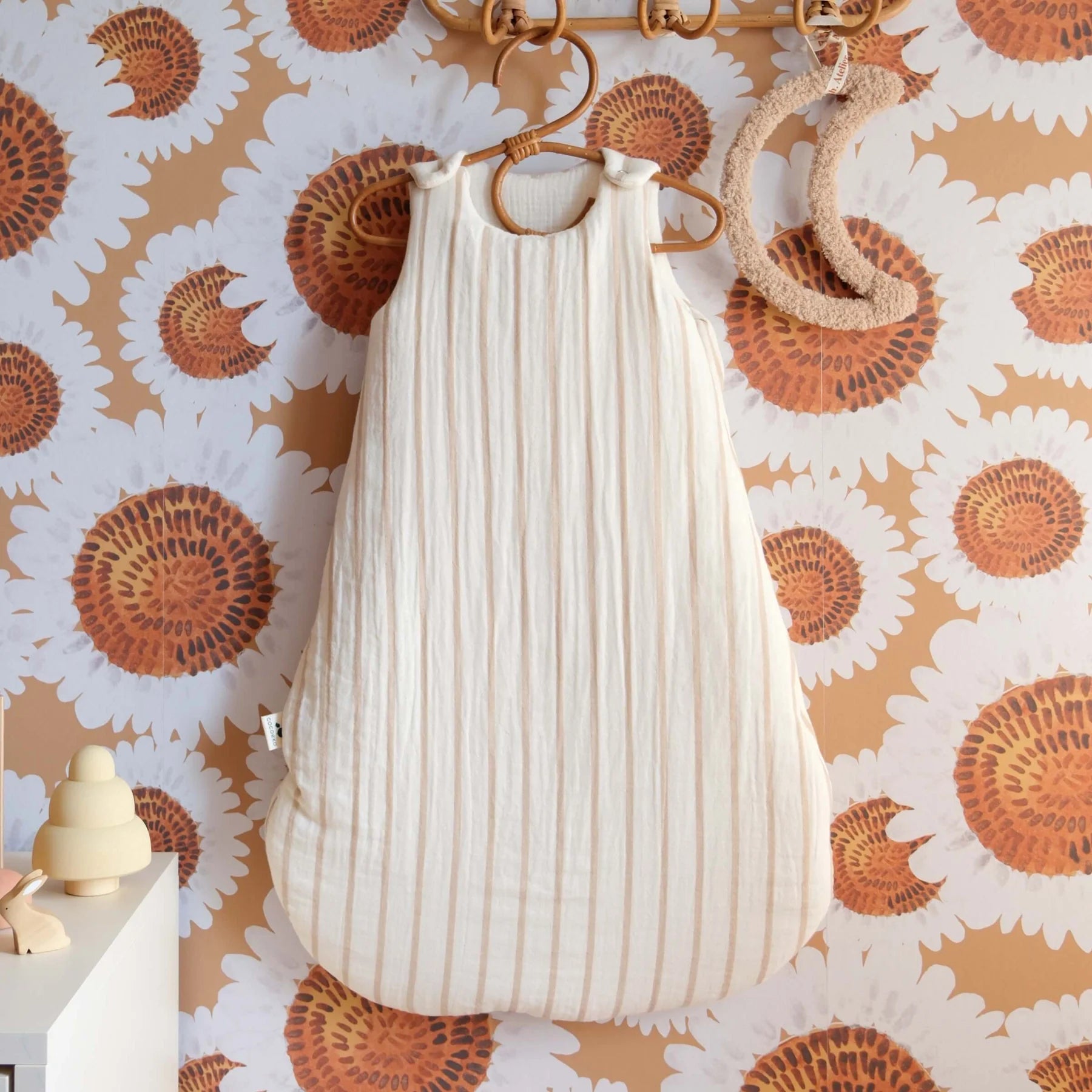 La Gigoteuse gaze de coton rayures beige TOG 2 de la marque Cocoeko est pensée pour offrir à bébé une chaleur douce et apaisée dans une chambre entre 18 °C et 22 °C.