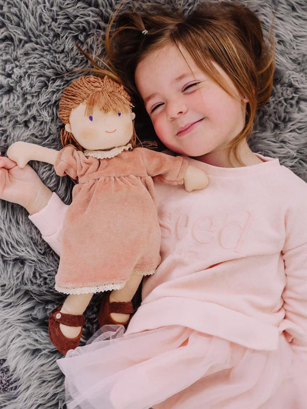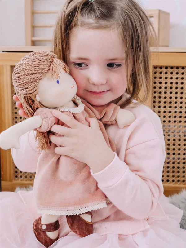 Un tendre visage pour mille histoires murmurées à l’heure du coucher… Voici Mona, une délicate poupée de chiffon au charme intemporel, prête à devenir la confidente préférée des tout-petits. Avec sa robe en velours vieux rose bordée de dentelle, ses ballerines assorties et sa chevelure tressée, elle évoque la douceur et l’innocence des jeux d’enfance. Son corps souple et léger est parfaitement adapté aux petites mains, dès 12 mois environ. Fabriquée avec soin à partir de matières textiles douces et naturelles, cette poupée incarne les valeurs chères à Vanille Coton : tendresse, sécurité et éthique. Un compagnon de jeu et de câlins, conçu pour durer et traverser les souvenirs.