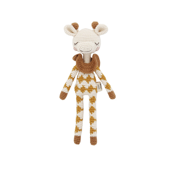 Avec sa frimousse paisible et ses bois sur la tête, cette girafe invite à la tendresse. Habillée d’un damier jaune et crème , il évoque la douceur.