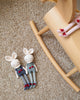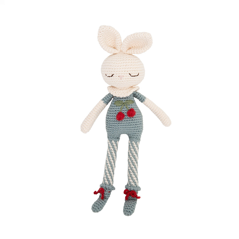 Avec sa frimousse paisible et ses longues oreilles toutes douces, ce lapin invite à la tendresse. Habillée d’une jolie combinaison bleu indigo ornée de deux cerises brodées à la main, elle évoque la fraîcheur d’un printemps en fleurs.