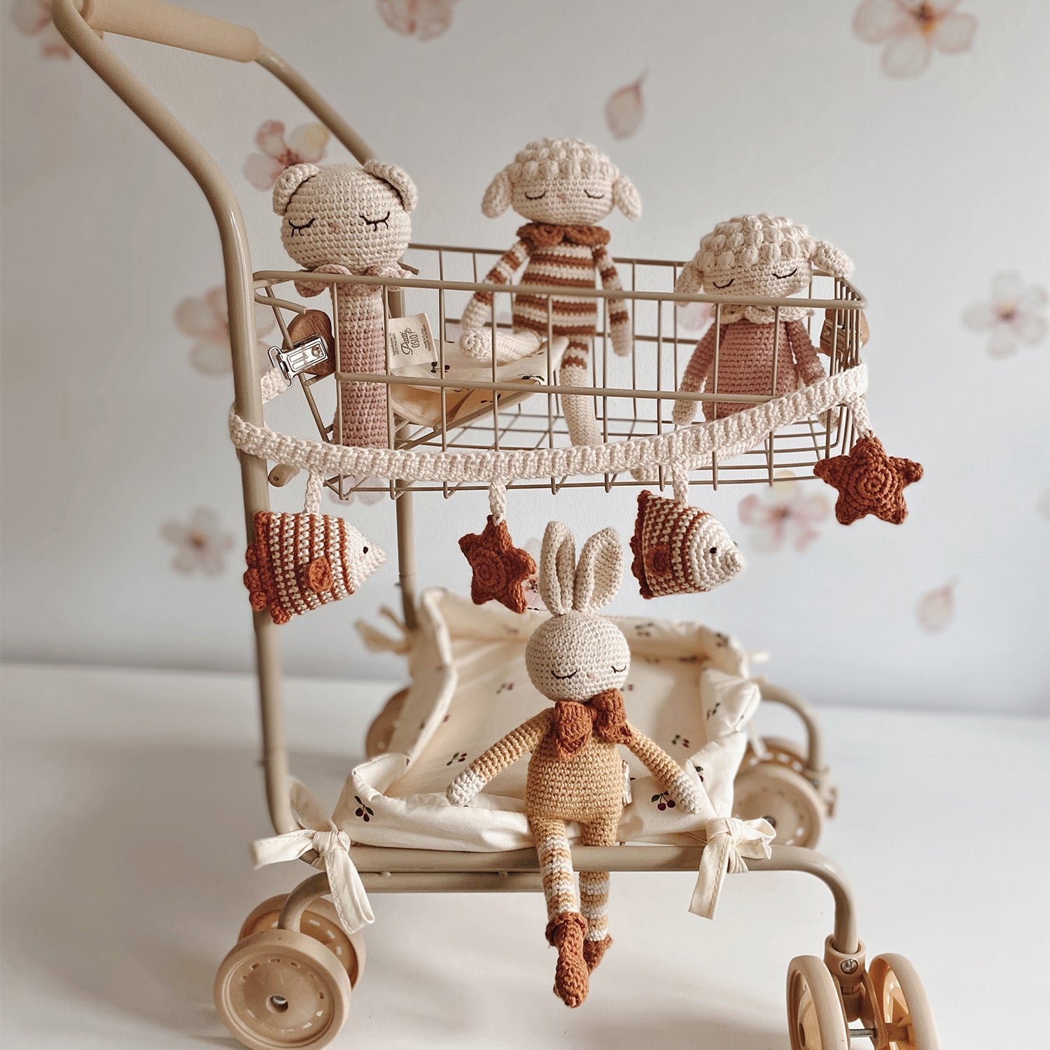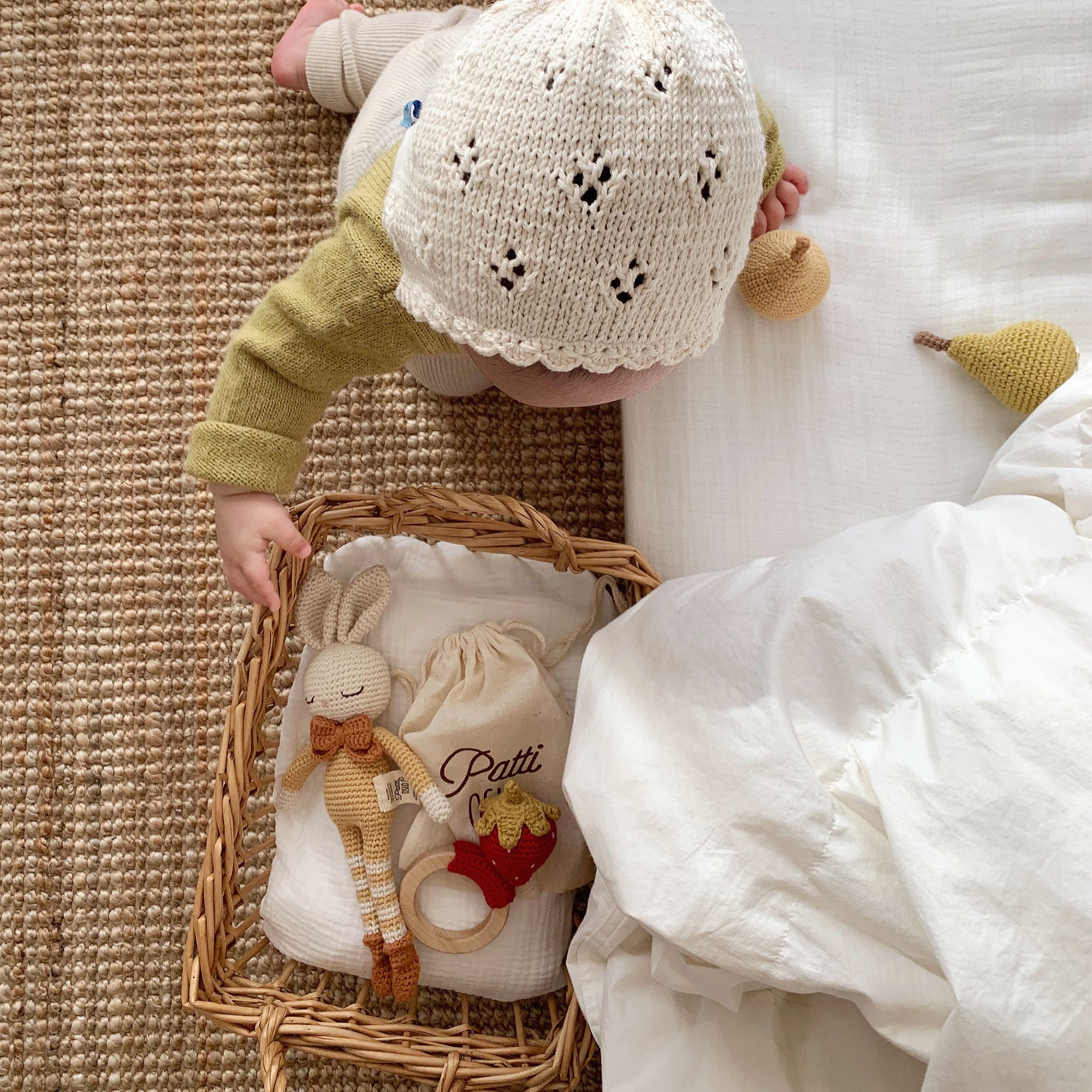 Avec ses longues oreilles, ses yeux paisiblement fermés et son col délicat, ce lapin en crochet incarne la tendresse à l’état pur. Tricoté à la main dans une maille serrée et douce, il offre à bébé un jouet rassurant, facile à attraper et à câliner. Sa texture en coton naturel stimule le toucher et accompagne les tout-petits dans leurs premières découvertes sensorielles.