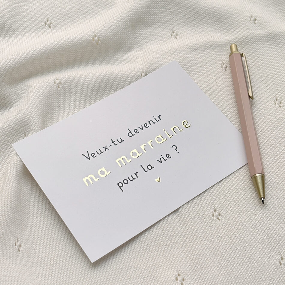 Avec la carte « Veux-tu devenir ma marraine ? », transformez un moment déjà fort en un souvenir inoubliable. Délicate et pleine de sens, cette carte est une manière originale et touchante d’annoncer à un être cher l’importance que vous lui accordez dans la vie de votre enfant.
