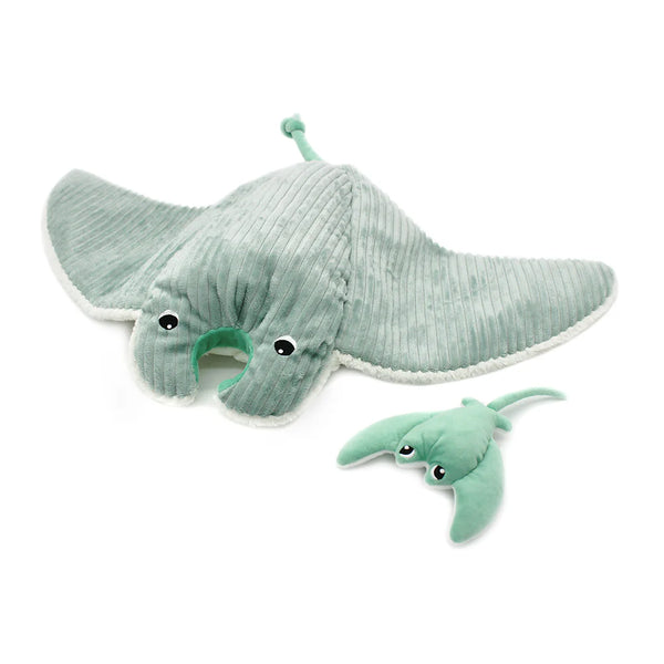 Avec ses grandes ailes toutes douces et son petit regard attendrissant, la raie manta transporte les enfants dans un monde sous-marin plein de tendresse. Lovée dans son ventre, une petite raie turquoise l’accompagne pour des instants complices et rassurants. Cette peluche mixe des textures veloutées, des teintes apaisantes et un design original pour éveiller les sens tout en offrant réconfort et câlins.