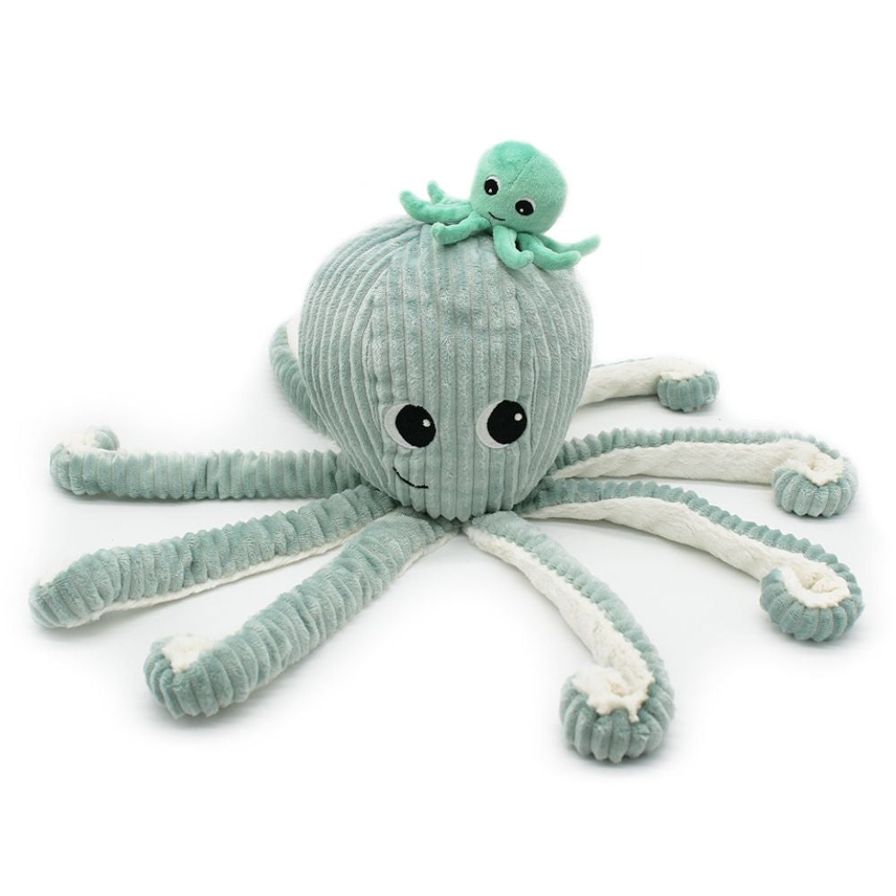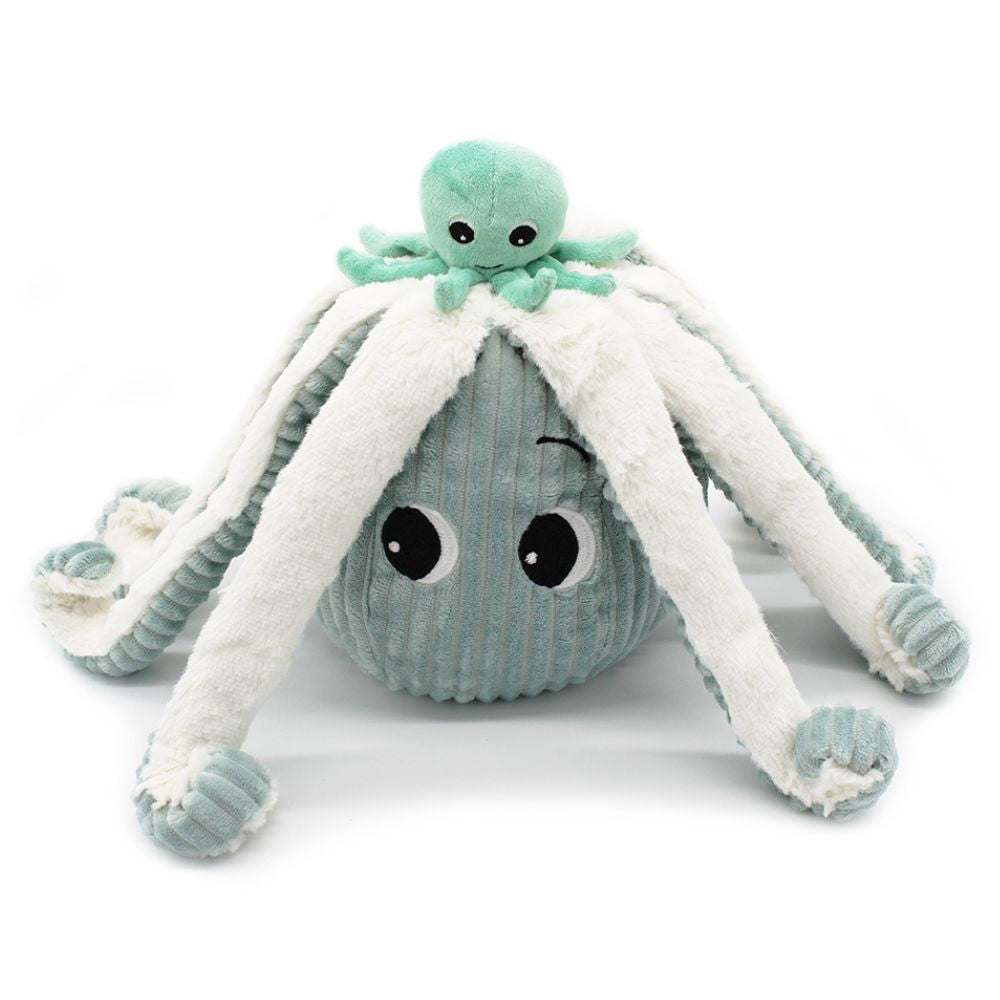La peluche « Pieuvre maman & son bébé », est un véritable hymne à la tendresse : maman pieuvre en velours côtelé bleu, accompagnée de son petit caché dans une poche velcro sous les tentacules. Grâce à ses 8 longs bras et son rembourrage en polyester recyclé, elle est à la fois responsable, cocooning et ludique. Dès la naissance, elle accompagne l’enfant dans ses premiers câlins et ses explorations marines imaginaires.