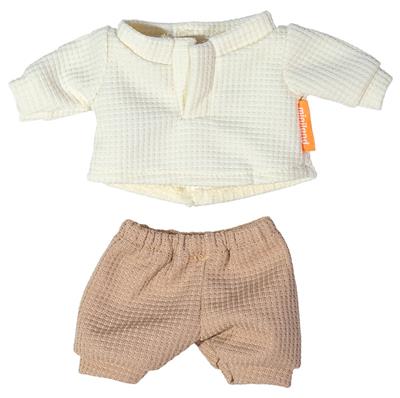 Vêtements pour poupées composés d'un tee-shirt et d'un pantalon marron et écru.