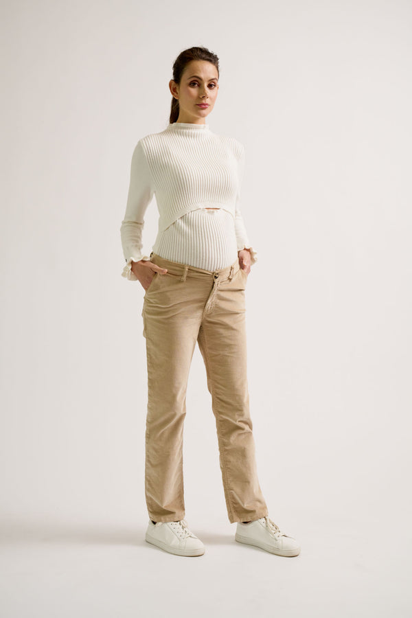 Le Pantalon de maternité William de Cache Cœur s’impose comme un essentiel du vestiaire de grossesse, pensé pour accompagner la femme enceinte avec confort, style et conscience. Conçu en velours milleraies stretch, il dévoile une texture noble qui glisse délicatement sur la peau tout en offrant une belle élasticité — idéal pour suivre l’évolution du ventre sans compromis. Grâce au système Caméléon intégré, une bande élastique ajustable à l’intérieur permet de gagner jusqu’à 24 cm de tour de taille : un vrai atout pour prolonger l’usage tout au long de la grossesse. Sa coupe droite, soignée, associée à de vrais détails de pantalon (braguette, bouton français, passants, poches devant et dos) lui confère un charme intemporel, à porter aussi bien au bureau qu’en week‑end. La matière est fabriquée en Espagne et la confection réalisée en Tunisie.