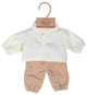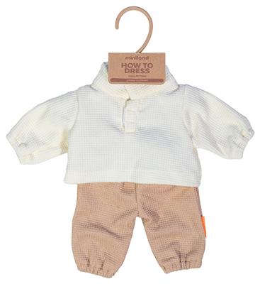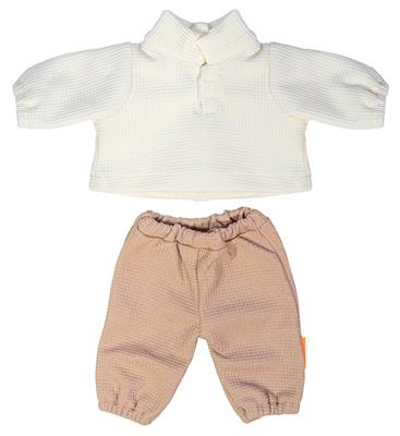 Vêtements pour poupées composés d’un pantalon et d’une chemise blanche en fibres recyclées.