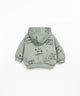 Sa couleur vert sauge chiné, parsemée d’inscriptions noires dessinées à la main, apporte une touche graphique originale. Il se ferme par un bouton en bois sur le devant, et sa coupe ample avec poignets et bas resserrés lui donne un look casual irrésistible.